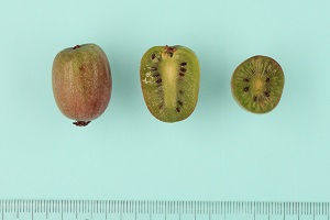 【果実】果実は5g前後でサルナシよりやや小さく,果面が果粉で被われます.幼果(左)、逗子系統(中)、明星ヶ岳系統(右)