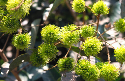 東南アジア原産の10〜15mになる高木。果実は10〜12個が房になり、鶏の卵大。幼果は緑色ですが成熟すると濃赤、黄赤色、緑色がかった赤色など品種特有の果色になります。果実の表面は柔らかく長い毛で覆われています。ランブータンという名前はマレー語で毛のようなという意味です。 果皮は柔らかく、手で容易に剥くことができます。内部に白色半透明の果肉があり、肉質は柔らかく多汁質で甘味が強い。ただし、種皮が剥がれて口に残るのが欠点です。 果実はほとんど生食されますが、最近では缶詰加工にも用いられています。種子、果皮などは昔から薬用にも利用されてきました。